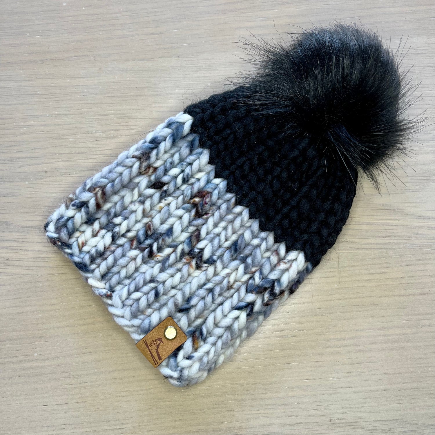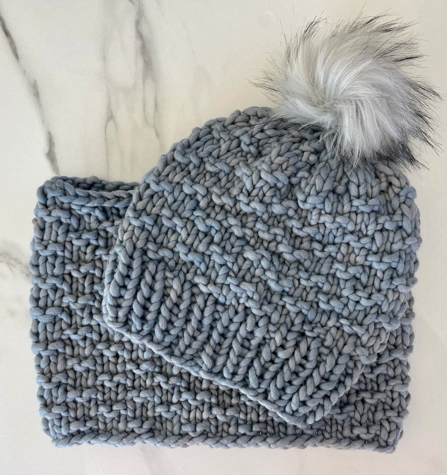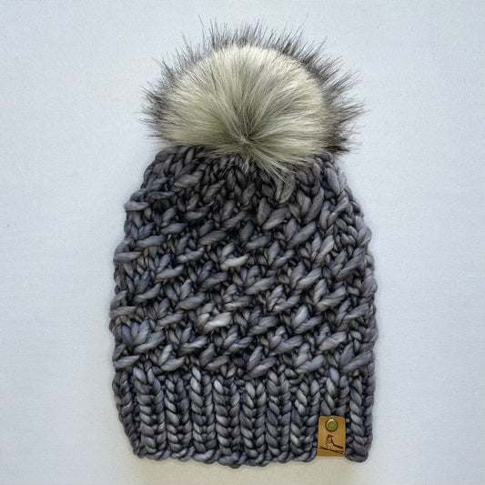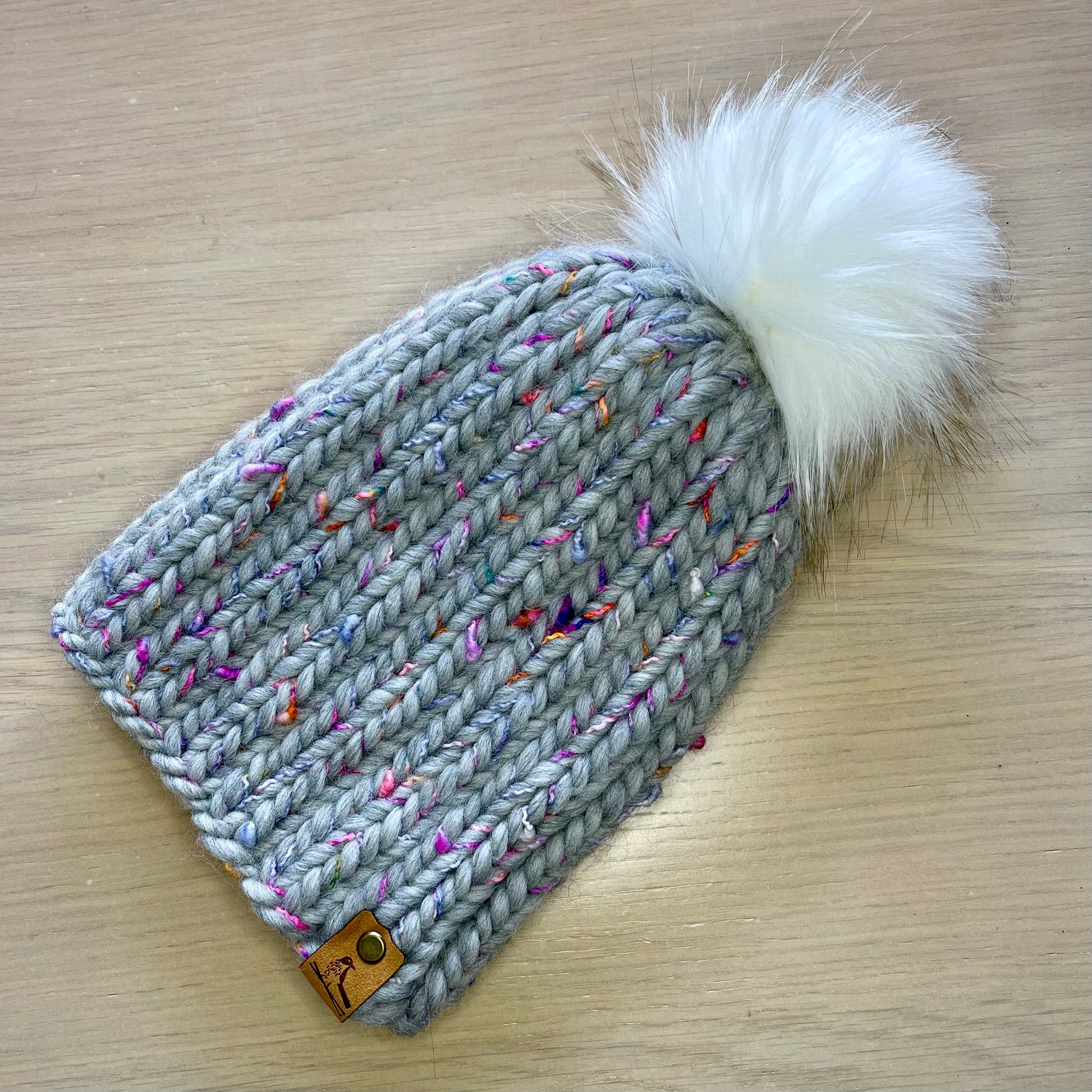 Grey Luxury Merino Wool Knit Hat with Faux Fur Pom Pom