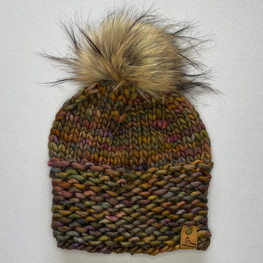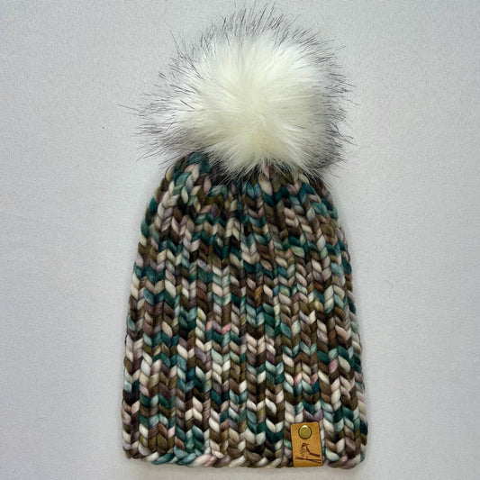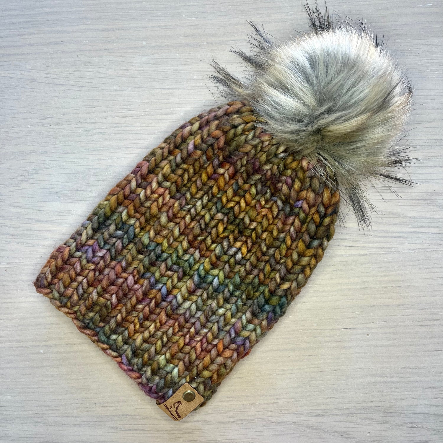 Brown Multi Color Luxury Merino Wool Knit Hat with Faux Fur Pom Pom