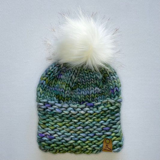 Green Multi-Color Luxury Merino Wool Knit Hat with Faux Fur Pom Pom