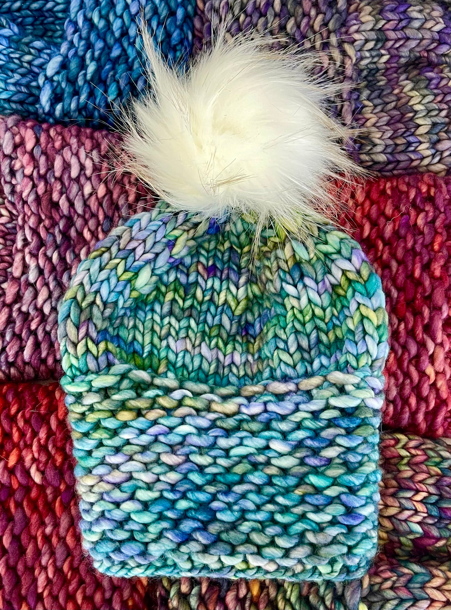 Aquamarine Luxury Merino Wool Knit Hat with Faux Fur Pom Pom