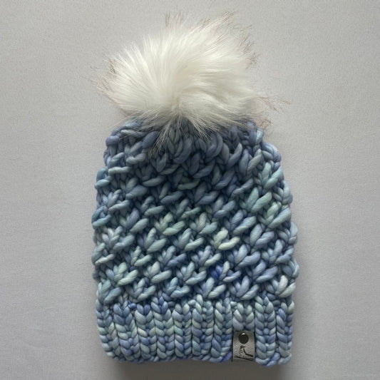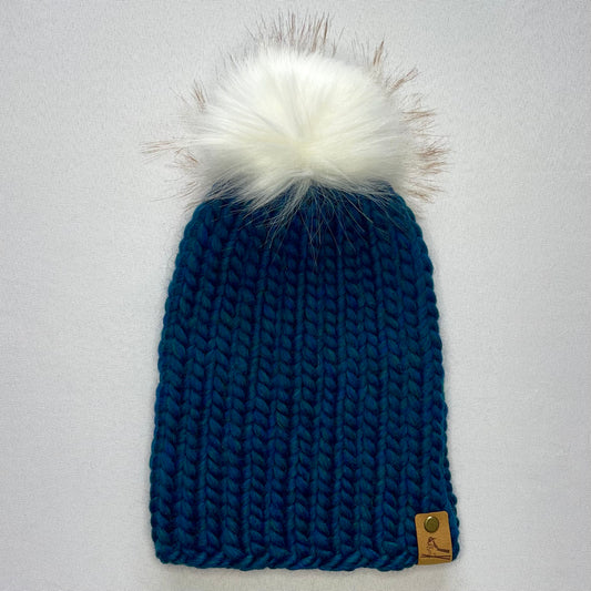 Blue Peruvian Wool Knit Hat with Faux Fur Pom Pom
