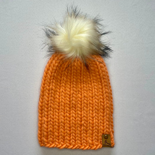 Peach Peruvian Wool Knit Hat with Faux Fur Pom Pom