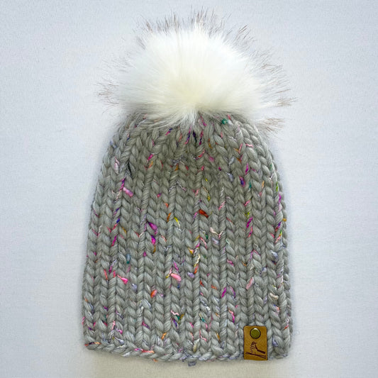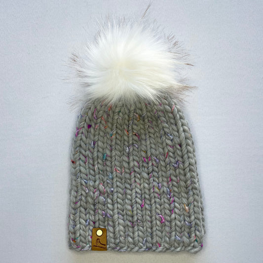 Grey Multi-Color Peruvian Wool Knit Hat with Faux Fur Pom Pom
