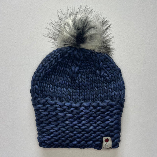 Navy Luxury Merino Wool Knit Hat with Faux Fur Pom Pom